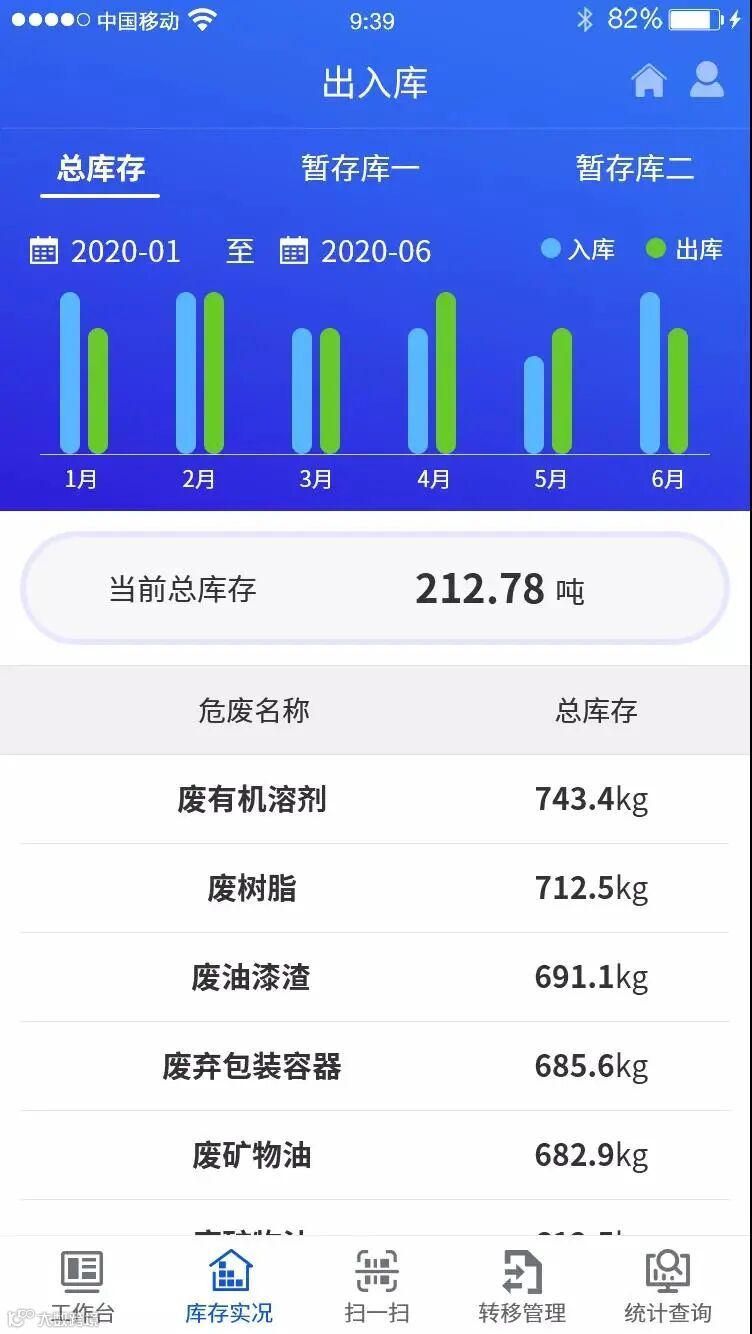 包含扫一扫、库存实况、出入库动态等功能模块,主要可提供危废仓库现场管理人员进行产废上报、扫描标签二维码进行出入库操作,同时可提供企业管理人员掌握各个仓库实时库存情况、出入库动态、各危废仓库现场视频监控等功能。