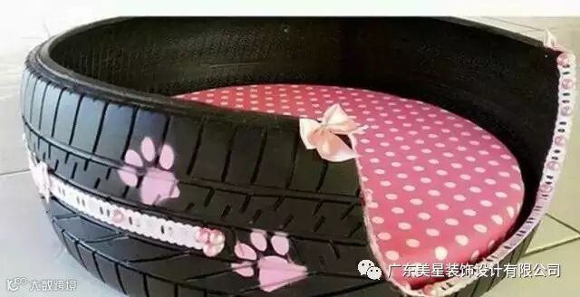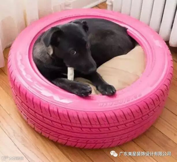 将旧轮胎清洗干净后,用刀切出一个小口以便宠物可以进出,再贴上一些滑步,放上一个垫子,就是宠物的小窝啦。
