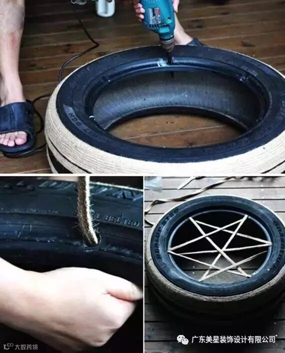 在轮胎内部凹槽处钻5个洞,将麻绳穿进去绕成五角星,首尾打结,这样就可以将垫子放上去了。非常方便哦。