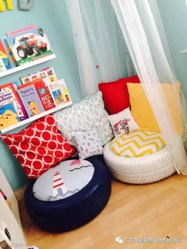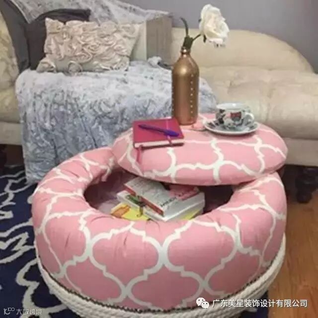 在轮胎的下面可以黏上一块薄木板,用来封底。而放在轮胎上面的垫子大小可以与它的凹槽处刚好重合,这样,中间就会留出位置来放书或者其他东西。