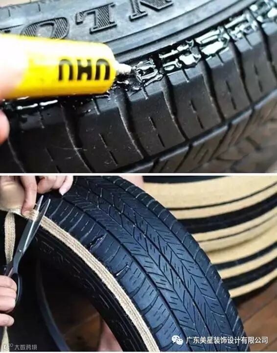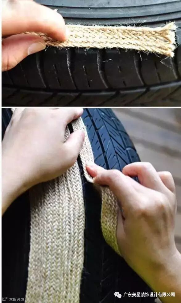 在轮胎的周围涂抹上胶水,将麻绳编织成的布条沿着边缘轻轻粘上去,然后按压固定。