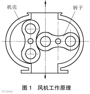 罗茨风机是一种容积型回转式气体动力机械,有2个腰形渐开线转子,通过主、从动轴齿轮使两转子作等速反向旋转,完成吸气排气过程。