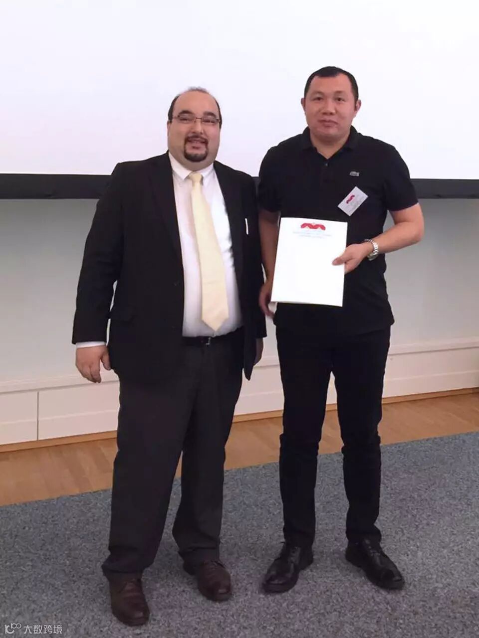 颁奖完毕后,下萨克森州管理学院代表给集团总裁杨耀祖、常务副总裁温建华颁发下萨克森州学院学习证书,双方合影留恋。