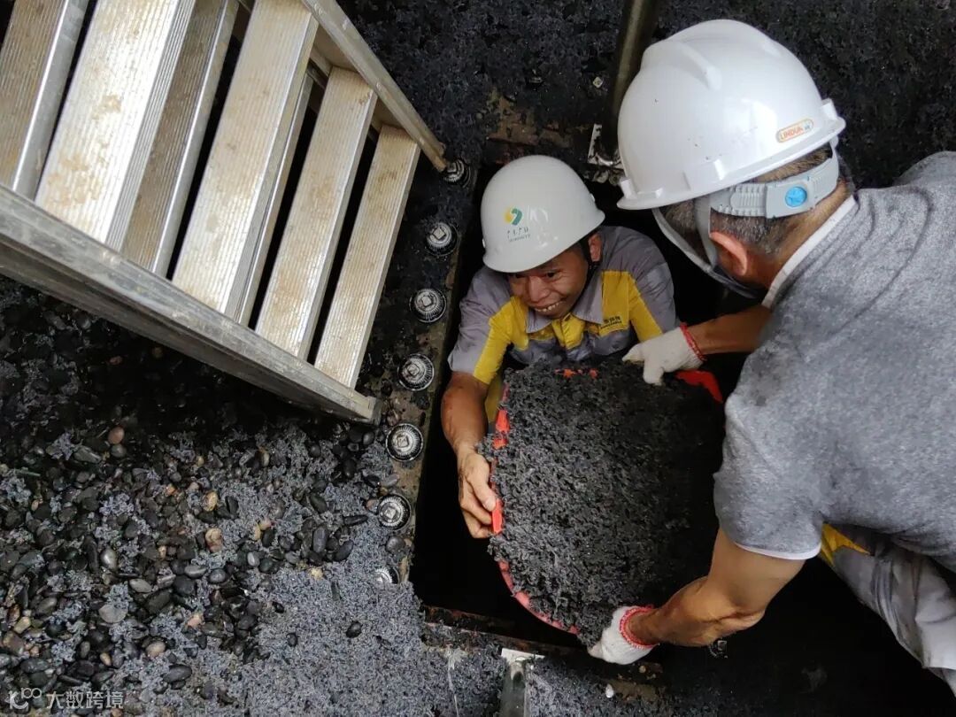 高温湿热阻挡不了党员先锋抢修队员们聚力攻坚的决心。为了快速锁定故障位置,减少滤板滤头二次损伤,抢修队员不得不在狭小的空间里,徒手用簸箕清理故障滤板滤头周边的滤料。他们相互配合,有的负责清理,有的负责接运,各司其职,各尽所能。在池内作业不一会儿,队员们身上的衣服就湿透了,汗水顺着脸颊往下淌,但他们毫无怨言,没有一个人叫苦叫累,抢修作业有条不紊推进。