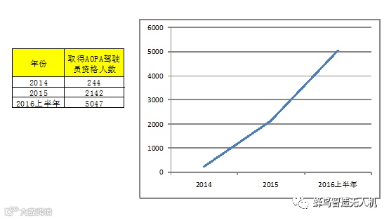 2014年国内取得AOPA无人机驾驶员合格证的约200余人,15年增至2000人以上,截止于2016年6月份就已达到5000人以上,但中国目前各行各业对无人机的需求是非常大的,包括测绘、电力、气象、环保、国土、海监等行业级无人机驾驶员的需求量就在5万人左右。在很长一段时间内,我国无人机驾驶员都将处于一种供不应求的状态,无人机驾驶员的培训将长期保持火爆。