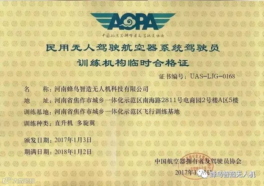 随着民用无人机行业的兴起,更多无人机飞上了天空,但是伴随而来的是管控问题。国家连续下发关于禁止“黑飞”,“要求无人机驾驶员必须持照合法驾驶”的文件,并将相关要求纳入国家空管制度。由于目前受过正规训练的无人机操控人才十分紧缺,河南蜂鸟智造无人机科技有限公司成立了无人机驾驶员培训中心,是AOPA(中国航空器拥有者及驾驶员协会)审定合格的无人机驾驶员训练机构,为各行业输出经过系统培训的持证上岗的优秀飞行人才。