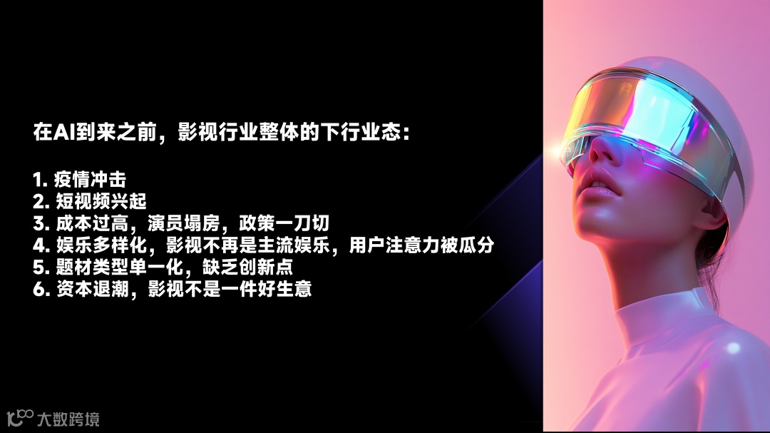 在AI到来之前,影视行业经历了整体下行。这是多维度社会因素综合作用的结果。覆巢之下,焉有完卵,唇亡齿寒的道理大家都懂,我一直对此抱有担忧。