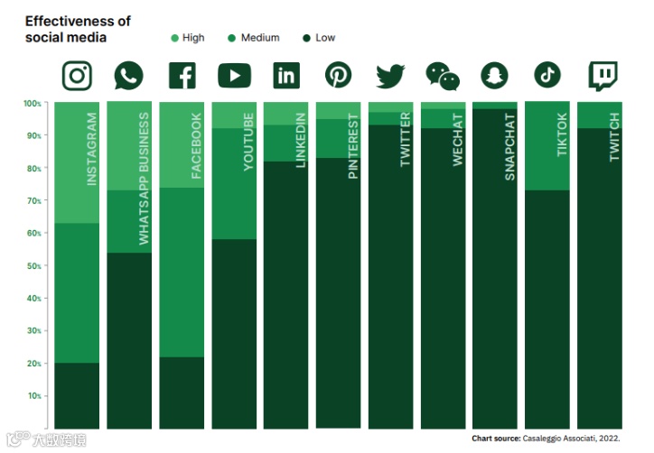过去被认为对意大利电子商务最有效的社交媒体是Facebook(26%),今年的排名下降到Instagram(37%)和Whatsapp Business(27%)之后。