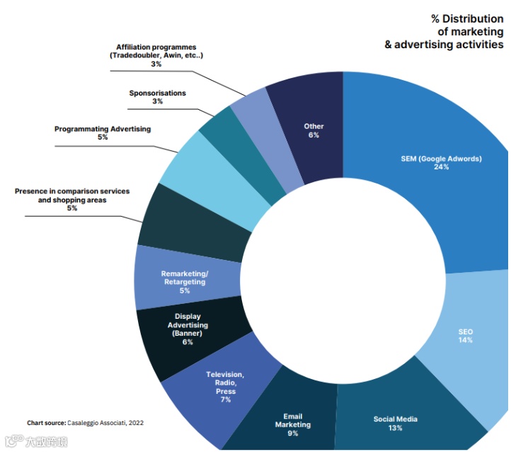 营销方面,广告和营销在疫情后再次成为意大利商场的中心,SEM(24%)依然是意大利市场上最受关注的营销途径,其次是SEO(14%)、社媒营销(13%)和邮件营销(9%)。