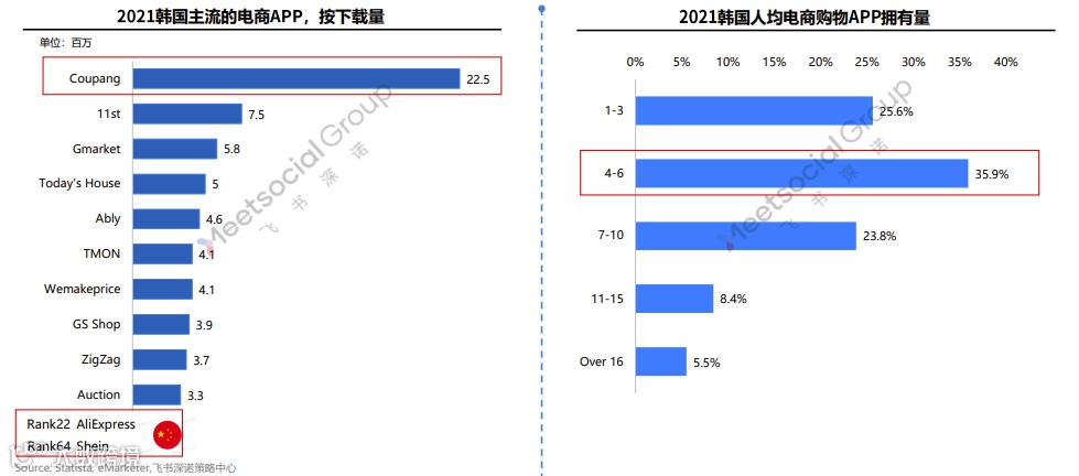 据飞书深诺发布的《2022年韩国电商与服装市场洞察报告》显示,韩国消费者青睐综合类购物网站,单一品类购物APP、折扣网站APP也占一席之地;2021年韩国人均电商购物APP以4-6个居多,近四成用户拥有7个以上购物APP。