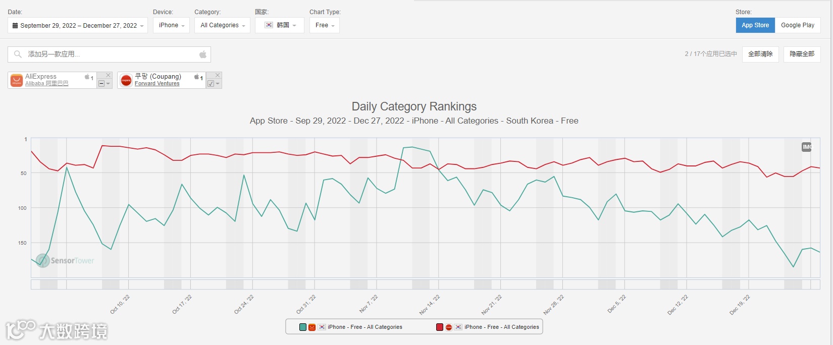 (Sensor Tower最近90天APP Store速卖通与Coupang每日品类排名对比)