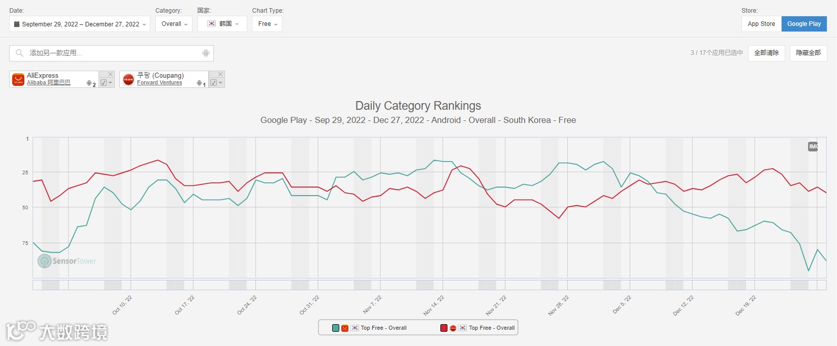 据移动数据平台App Annie统计,阿里速卖通在双十一及十二月中旬两次登上韩国市场购物类APP下载排行榜第一位,超过当地电商平台Coupang。