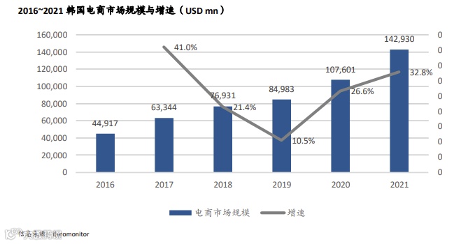 事实上,据韩联社报道,韩国的电商规模已经达到1200亿美元,是全球第五大电商市场,与整个东南亚市场相当。而据数据咨询公司Euromonitor数据显示,韩国电商市场已经达到1429亿美元,2020年、2021年增速分别达到26.6%、32.8%。