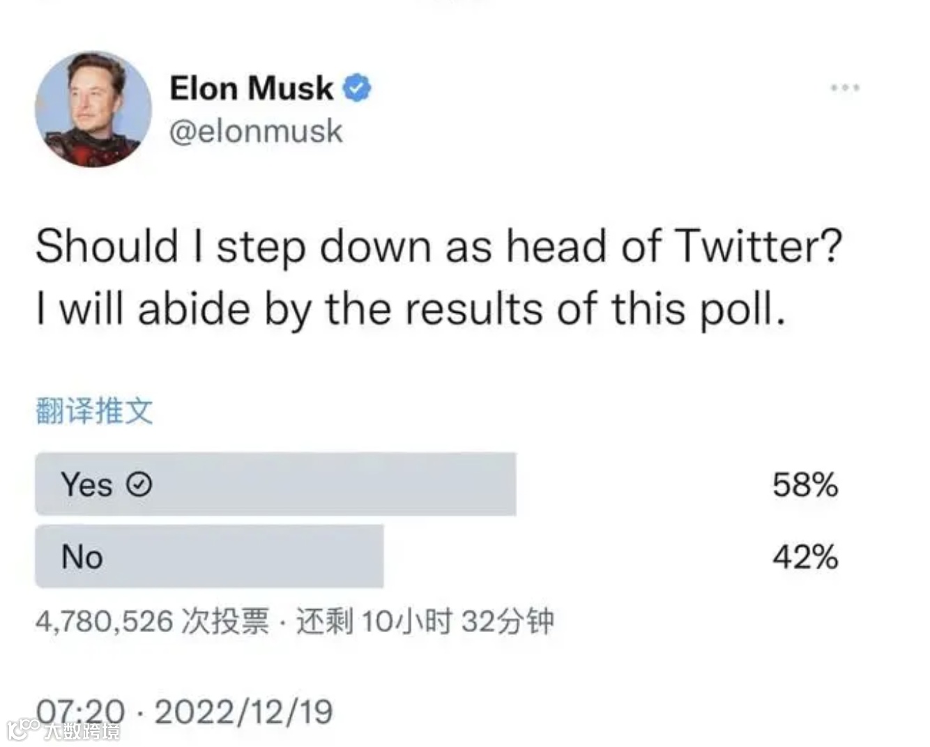 12月19日,埃隆·马斯克(Elon Musk)在Twitter就自己“是否应该辞去Twitter CEO”发起投票,并表示:会遵守投票结果。目前,已有近六成的参与者投出了赞成票。