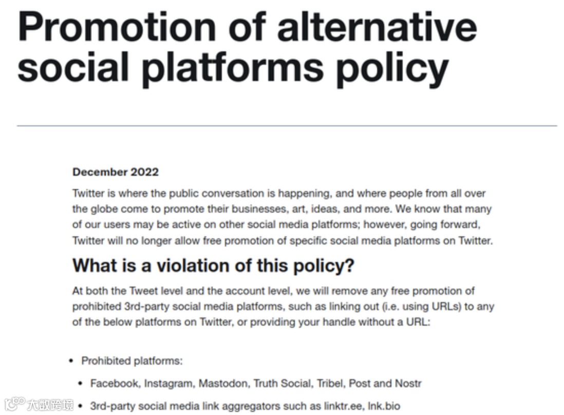 12月18日,Twitter官方账号Twitter Support发文称,“我们的许多用户都活跃在其他社交媒体平台上。我们将不再允许在Twitter上免费推广某些社交媒体平台。”