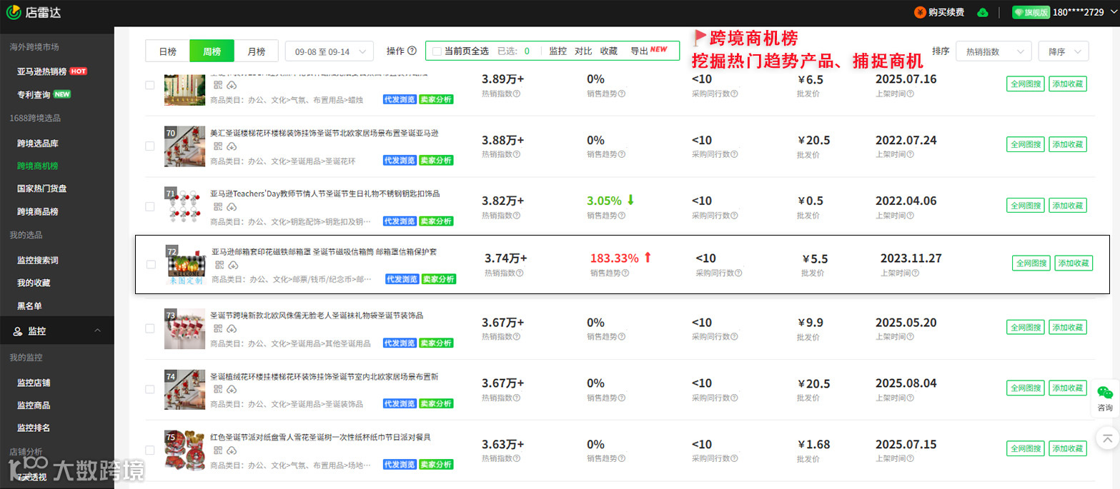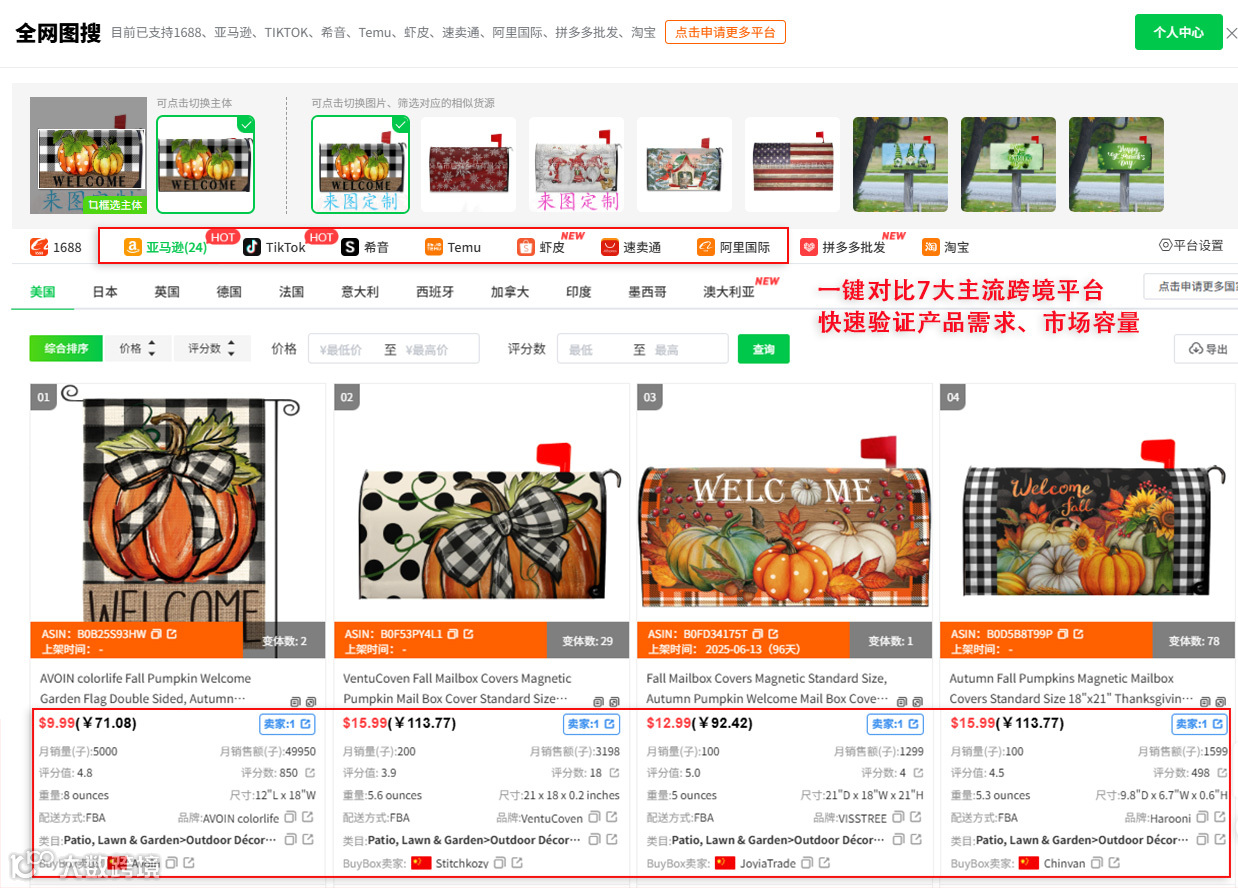 针对万圣节、圣诞节、感恩节等重要节日,消费者更加注重氛围感营造,类目涵盖家居装饰、服装、道具装扮、宠物配饰等,卖家可借助店雷达跨境商机榜发掘热门趋势品、捕捉商机,并结合全网图搜功能对比多平台售卖数据,从而快速验证市场需求与容量,例如,在亚马逊表现优异的产品,在TikTok上未必热销。