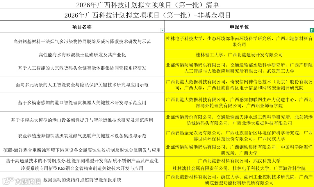 近日,自治区科技厅公布了2026年第一批广西科技计划拟立项项目的公示清单,北部湾港集团共有8家单位11个项目入选,标志着北部湾港集团在关键技术创新与产业化应用领域再获重要认可。
