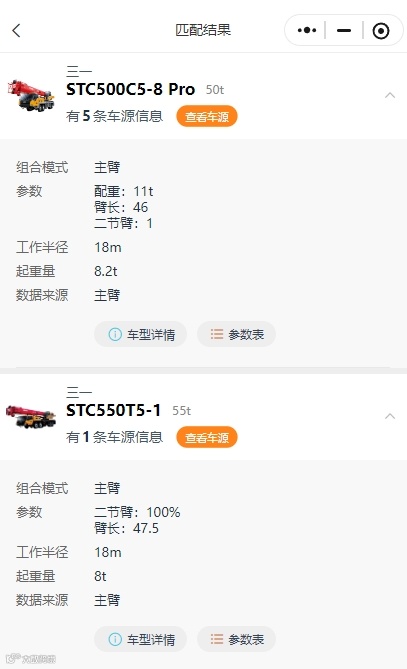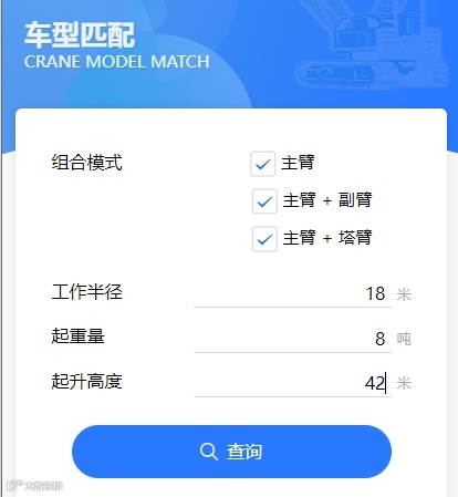 - 点击查询,系统快速匹配出符合条件的吊车型号列表,并附带详细工况参数,便于进一步筛选确认。