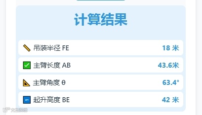 - 获取计算结果:系统显示所需吊臂长度为43.6米,起升高度需达到42米,为后续选型提供依据。