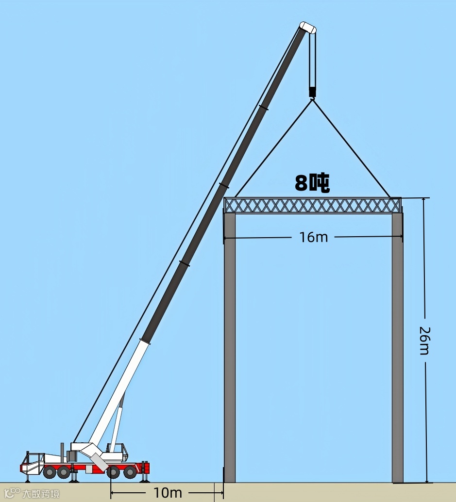 本次吊装任务需将一台重8吨、长16米的网架吊装至26米高位置,吊车回转中心距钢梁边缘10米。