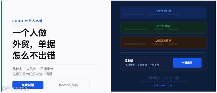 适用于产品种类较少、客户条款统一的场景。访问fobtools.com填写基础信息即可导出PDF单据,无需注册。