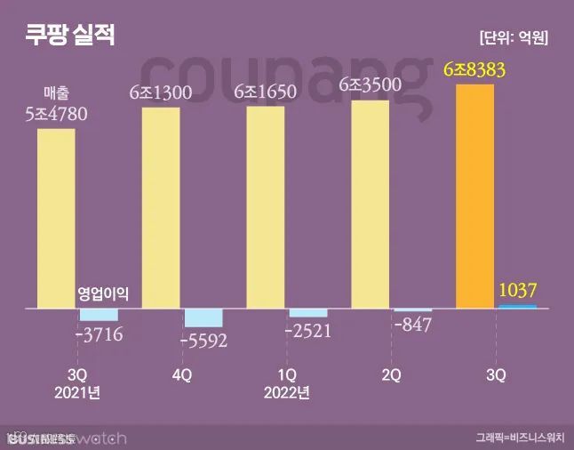 不过靠着规模效应,Coupang终于在今年第三季度实现盈利。第三季度销售额为 68,383 亿韩元,营业利润为 1,037 亿韩元。