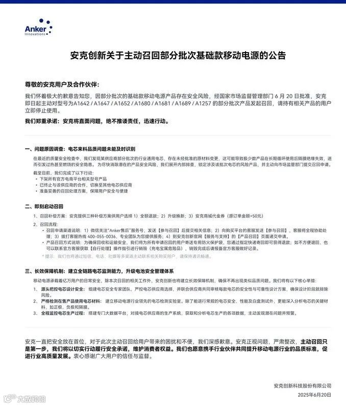 6月20日,安克创新发布关于主动召回部分批次基础款移动电源的公告。