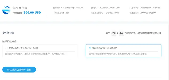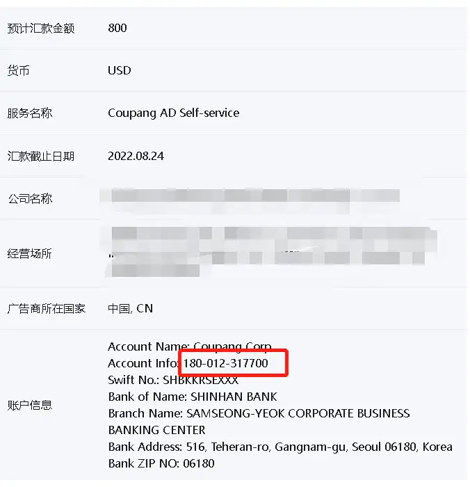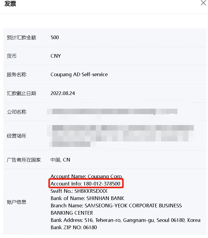 (注意:付款后提供汇款记录+企业ID+汇款金额+下载的发票给cmg_arteam@coupang.com)