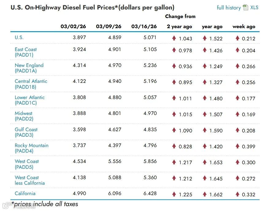 截至3月16日,全美柴油均价达5.375美元/加仑,单周涨幅4.3%,同比暴涨41%。加州部分地区价格逼近6.5美元/加仑。