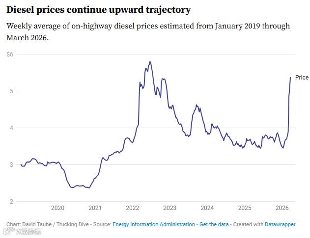 3月初全美柴油均价仍在4美元以下,3月9日单周跳涨96美分,创下近年最大单周涨幅。至3月24日,均价站稳5.375美元。相较之下,美国柴油价格仅一个月内涨幅相当于国内油价从6元升至8.5元。考虑到当地重型车辆普遍配备大容量油箱,运输成本激增显著。