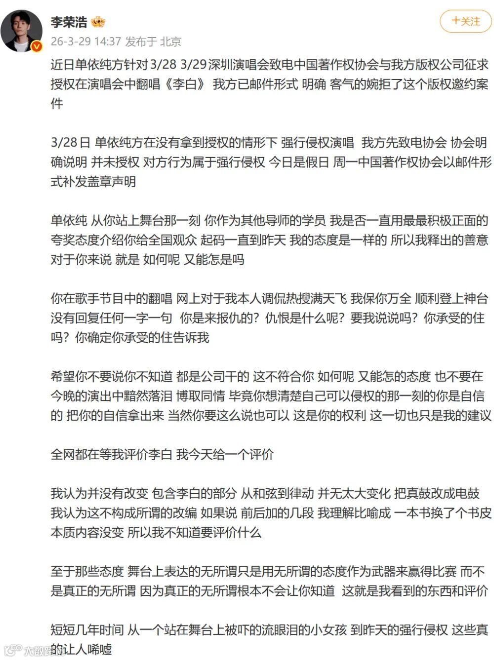 个人演唱会上演唱李荣浩作品《李白》,该曲曾因改编加入"如何呢,又能怎"引发争议。值得注意的是,商业演出需获得版权方授权,而李荣浩明确拒绝了单依纯团队的版权邀约申请后,对方仍违规演唱。