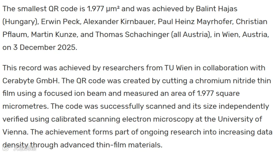 世界最小二维码正式诞生,刷新吉尼斯世界纪录,尺寸仅1.977平方微米。