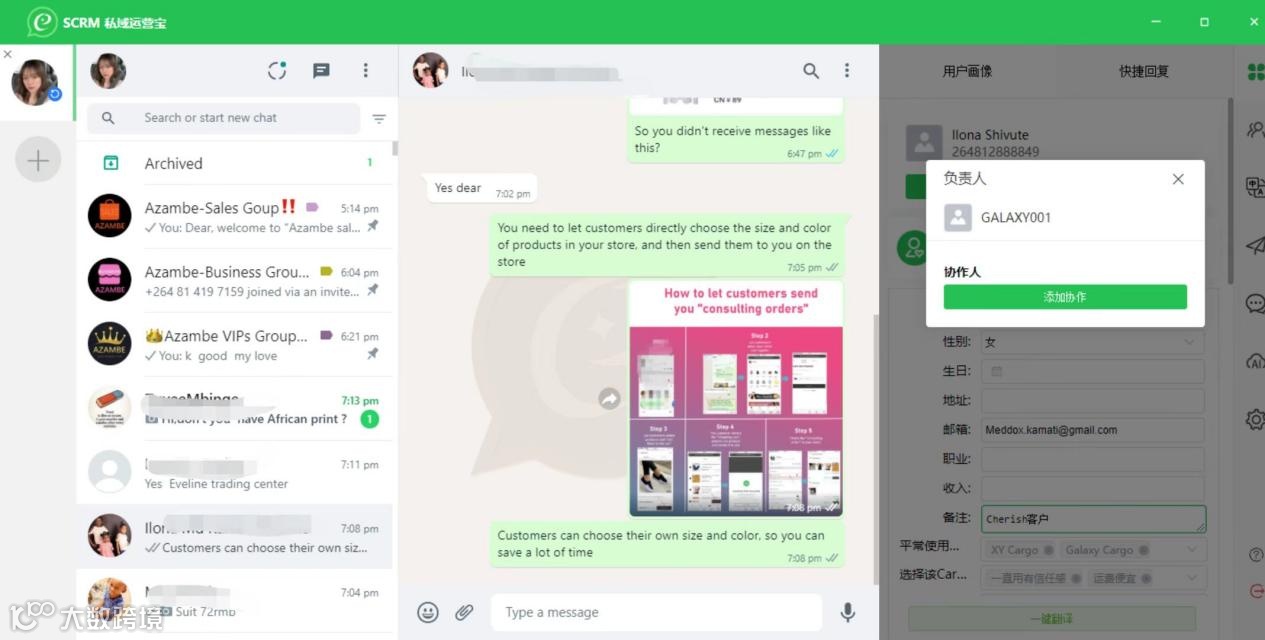 打开WhatsApp SCRM客户会话框,在右侧客户信息栏都有增加协作人的功能,通过添加协作人,可以实现: