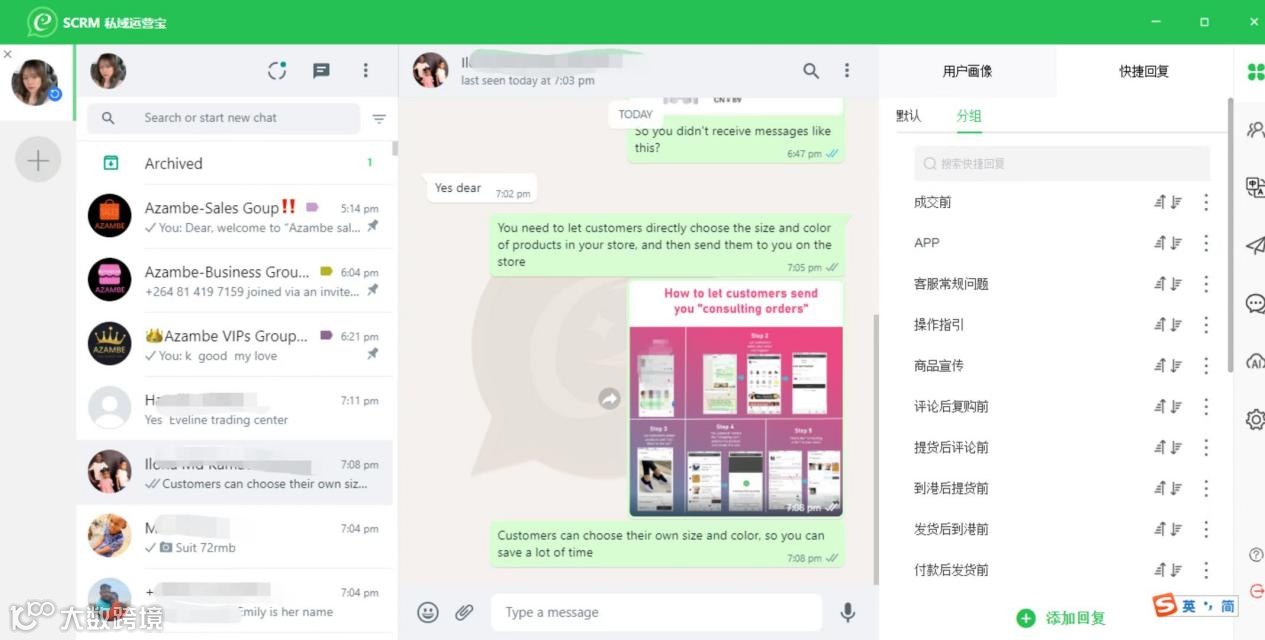 WhatsApp SCRM,通过客户会话框右侧的信息栏功能,帮助Azambe业务员及时高效地记录客户信息,直观地查阅洞悉客户情况,消除信息滞后、孤岛、不同步等问题,提高内部信息沟通流转效率,用在线化数字化的信息协同消除无端内耗。