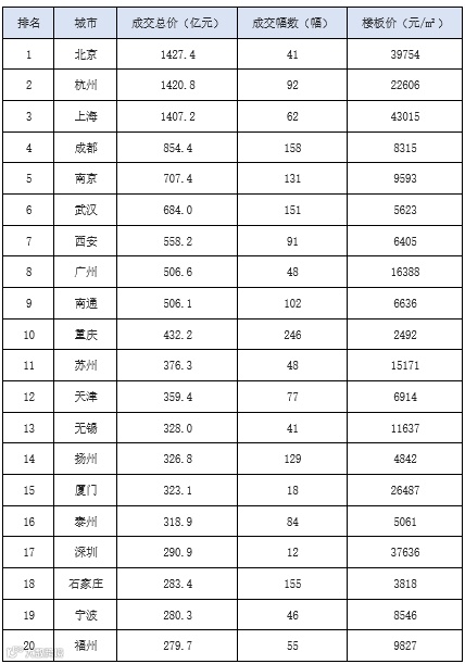 表1 2025年涉宅用地成交总价城市排行