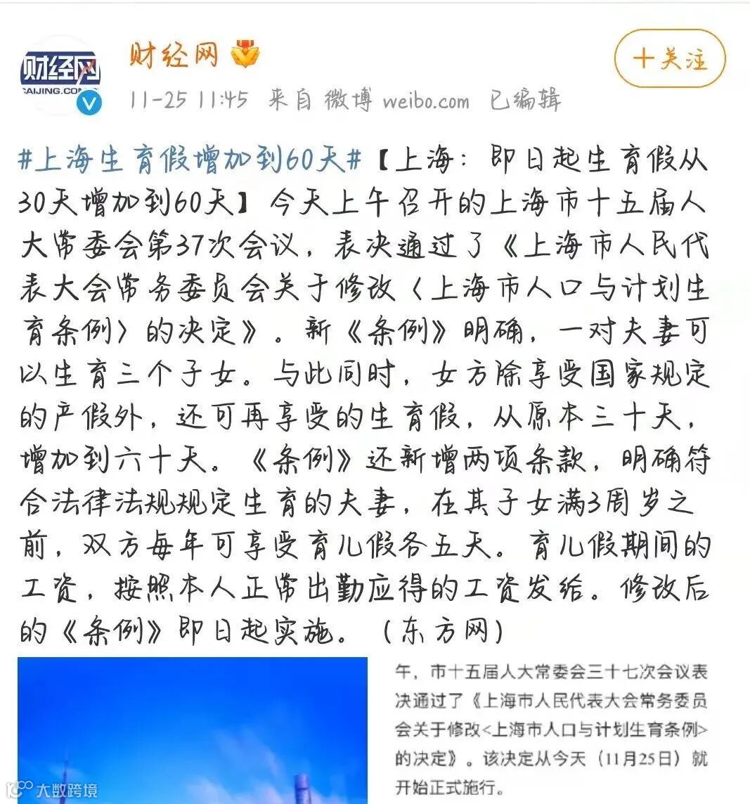 今天上午,“上海生育假增加到60天”这一话题登上了微博的热搜,引来了网友的热议。