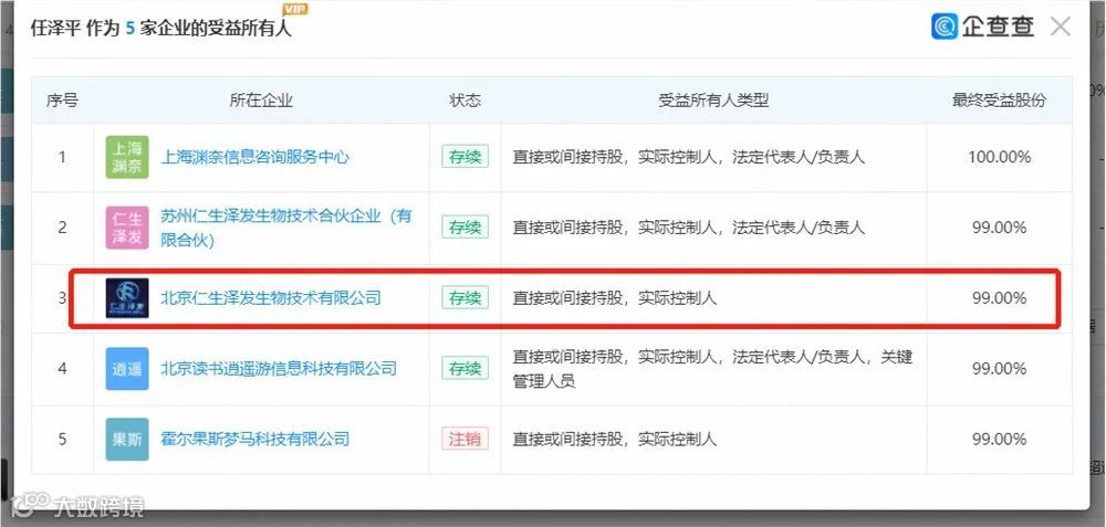 不过企查查上已经显示出,北京仁生泽发生物技术有限公司的最终受益人是任泽平。