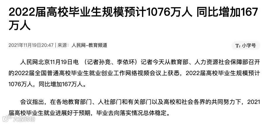 越来越多大学生追逐“公门”的另一面,是巨大的就业压力:2022届高校毕业生规模预计1076万人,同比增加167万人;随着经济下行,就业市场收缩。每年毕业即失业现象也越来越严重。
