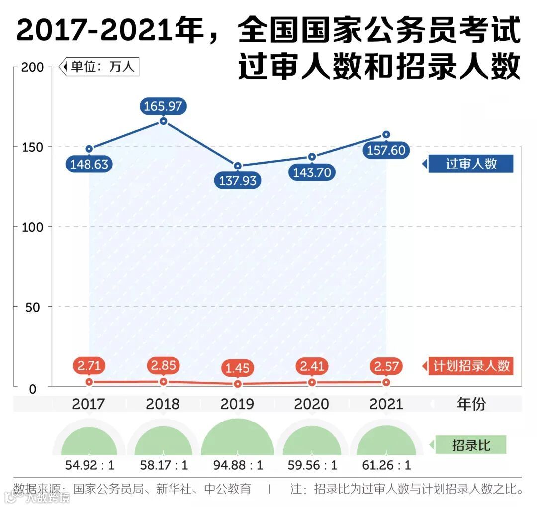 2022年度国考中,近67%的岗位仅向应届毕业生开放。国考考录比从2003年的16:1一路攀升至2022年的46:1。