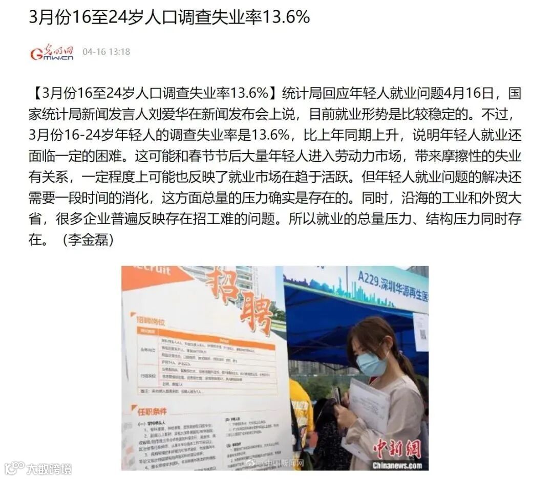 2021年4月16日,国家统计局新闻发言人刘爱华在新闻发布会上说:3月份16-24岁年轻人的调查失业率是13.6%,比上年同期上升。