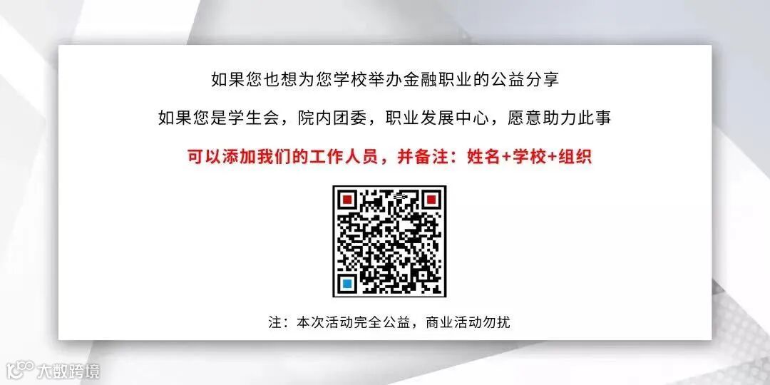 我们致力于以高校巡讲的方式,与来自各大金融机构的在职导师和优秀的师兄师姐一起,共同打破金融求职的信息壁垒,帮助你做好职业规划,找到理想中的工作。在接下来的时间里,金融小伙伴将走遍全国高校,走近你,采取线下宣讲的形式,惠及更多小伙伴,敬请关注。