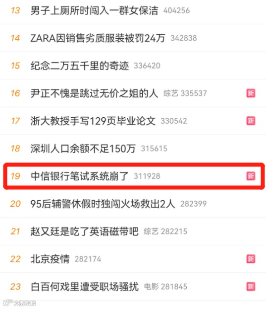 今天, “中信银行笔试系统崩溃”话题冲上了微博热搜榜。