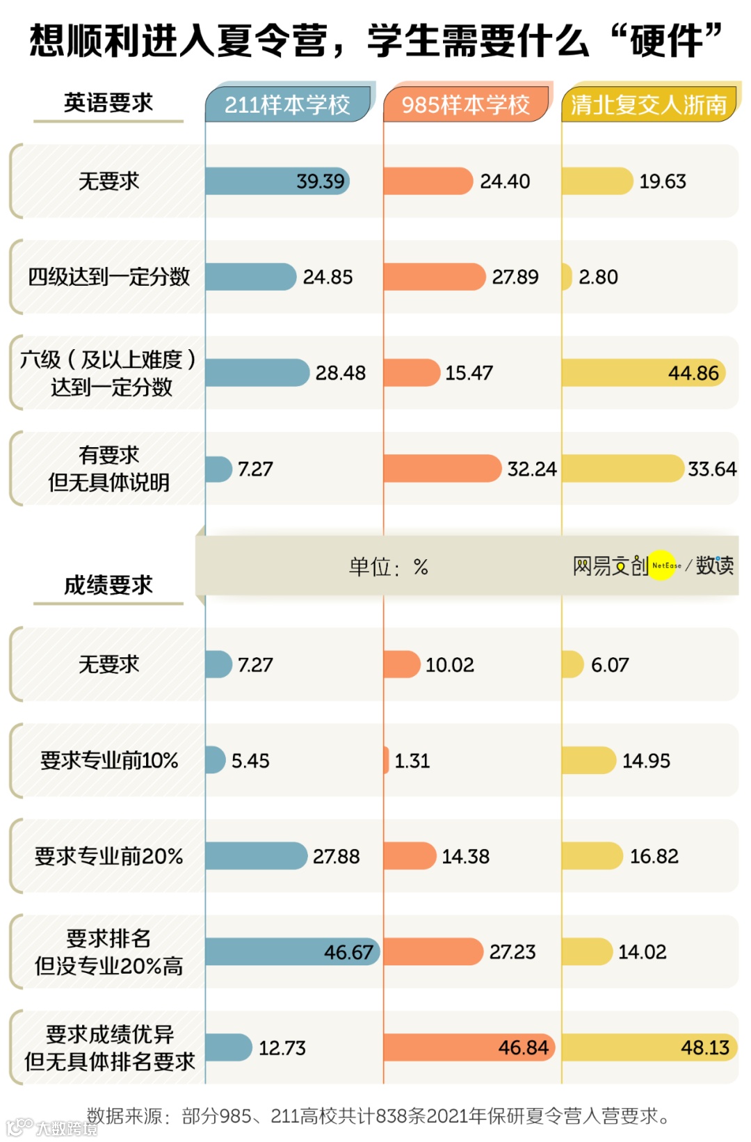 从整体看,无论是 211 还是 985,九成的入营条件都有要求营员成绩优异。