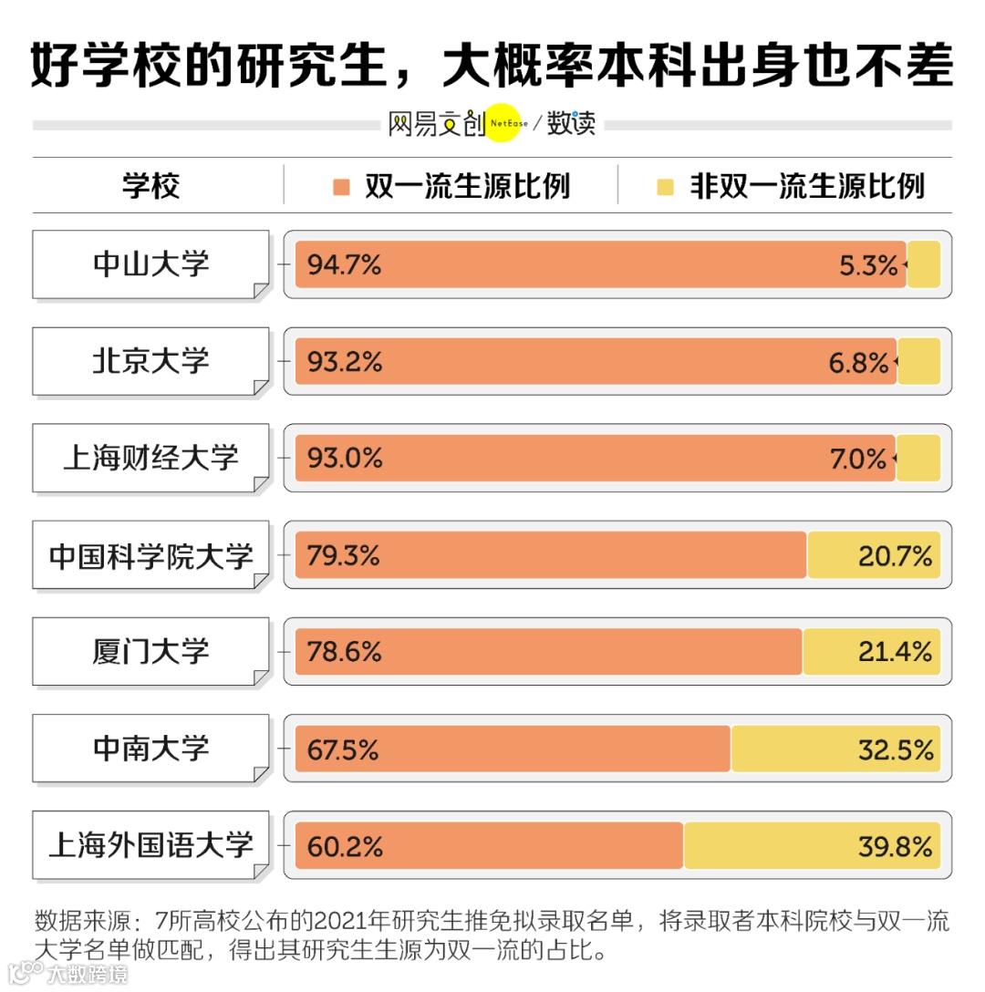2021 年保研,北京大学录取的推免生,93.2% 来自双一流学校,仅 6.8% 为“双非”学生,中山大学的比例差距甚至更大,94.7% 的学生都来自“双一流”。