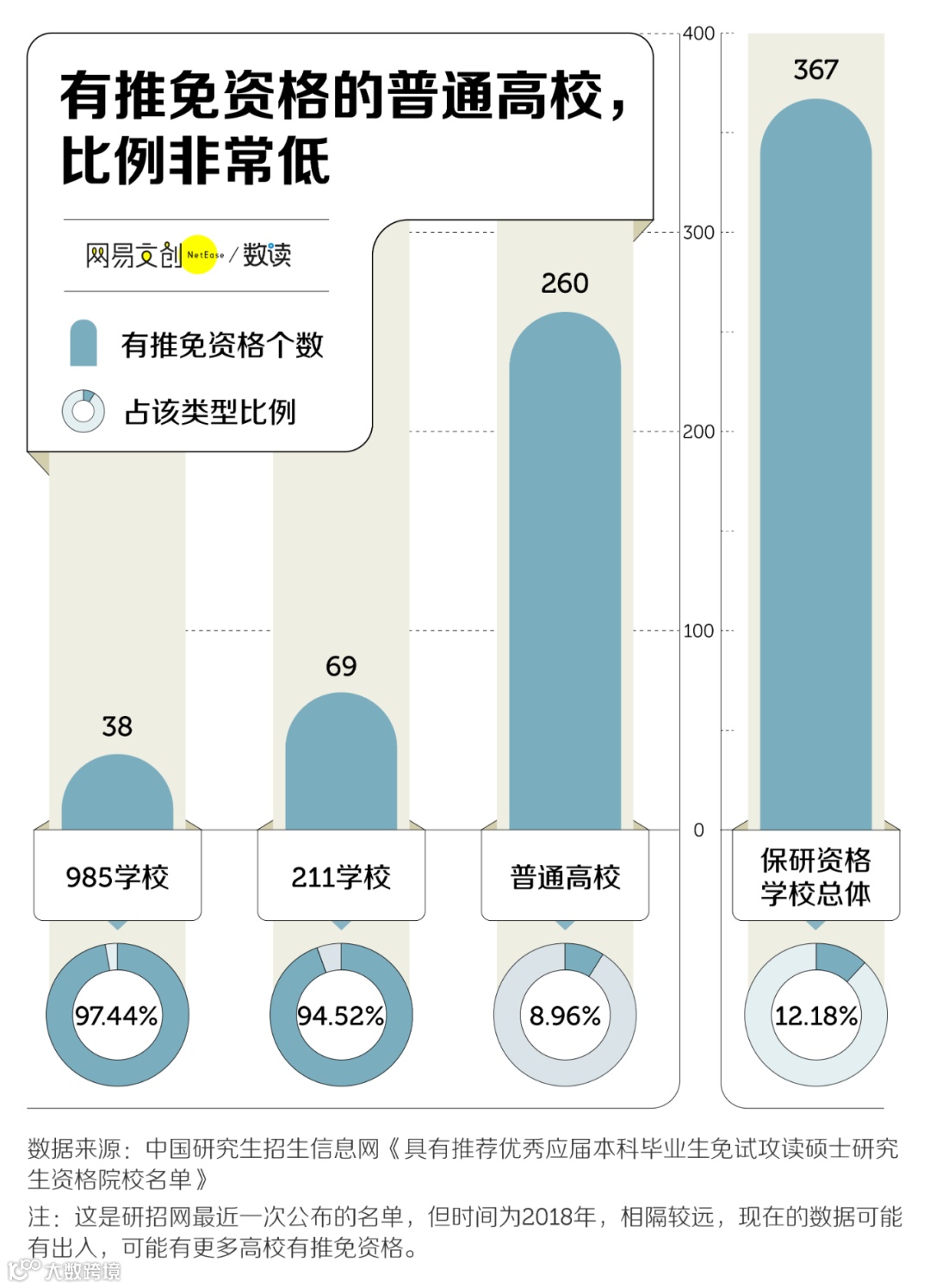 目前,大陆高校共有 3013 所 [4],而按研招网上的名单,具有推免资格的院校只有 367 所,也就是说,仅有 12.18%的高校有资格向学生派放“特别通道”的入场券。