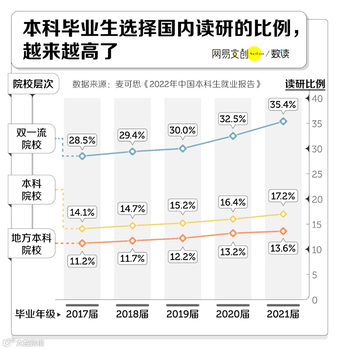 根据麦可思研究院的调研数据,应届生本科读研比例从 2017 届的 14.1% 逐年增至 2021 届的 17.2% [3]。