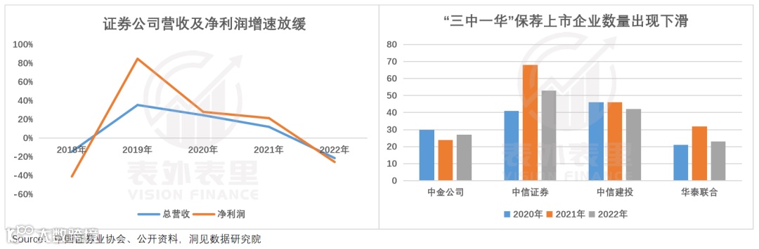 事实确实如此。中证协数据显示,近几年行业营入和净利润增速双双下滑,2022年更是负增长均超过20%。募资寒冬下,“三中一华”业绩也集体承压。