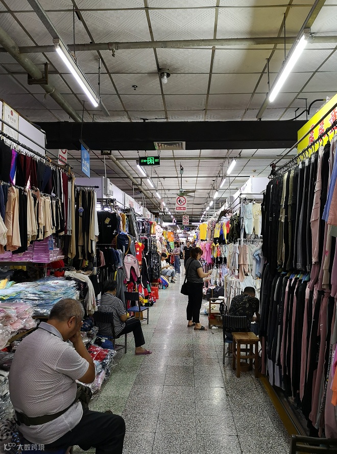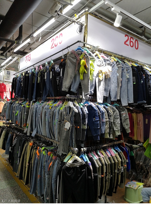 四楼主营服装,是很多路边摊的货源地。顾客很少,只有些上了年纪的人在走走看看。有铺主在过道上摆放了茶台,清闲地喝着茶,小半天也没等到几个客户。有少量摊位无人经营,老板在摊位上贴着招租小广告。