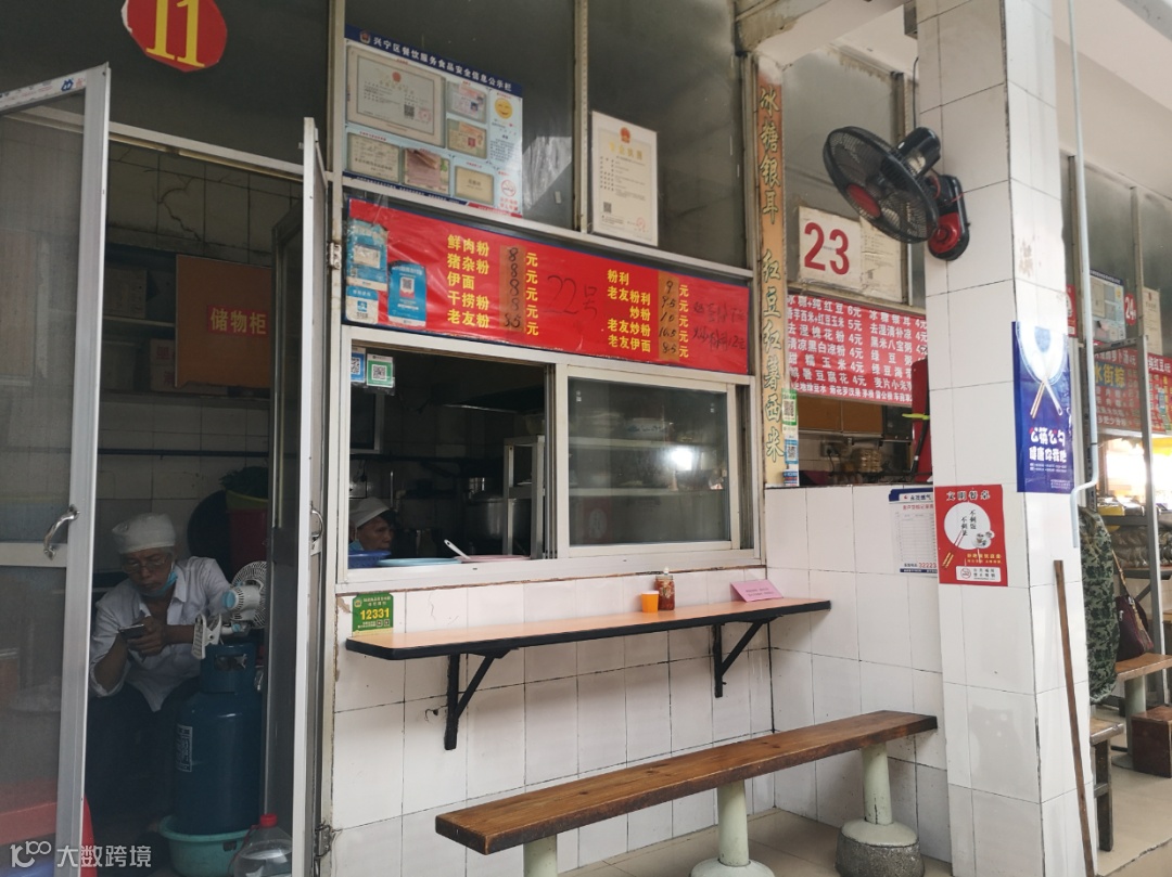 从靠近大和平的侧门进去,首先遇到的是一排餐饮铺面。粽子、米粉、面、饺子等等美食都有供应。每个铺面一小格,一对固定了的长条木桌椅招待着零零星星的客人。槽哥要了一碗三两猪杂粉,店主是一对老年夫妻。粉的价格实惠,分量中等,刚好能让我从一个有气无力的早晨变得精神抖擞起来。