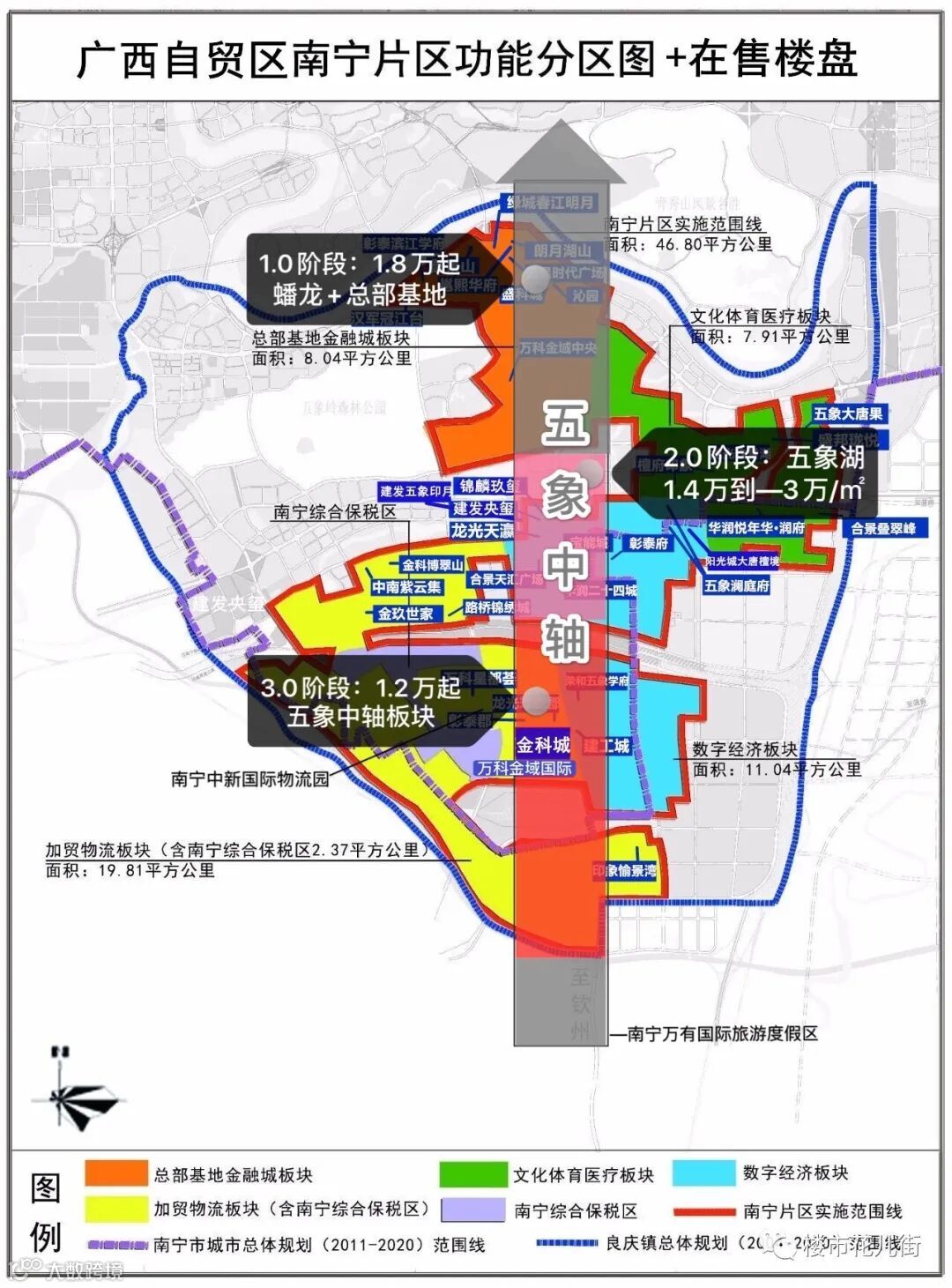 花儿姐特地用自贸区南宁片区的底图标注了“五象中轴”的示意图。从楼市的角度看,五象中轴可以说一路往南拉出了五象楼市的发展轨迹。